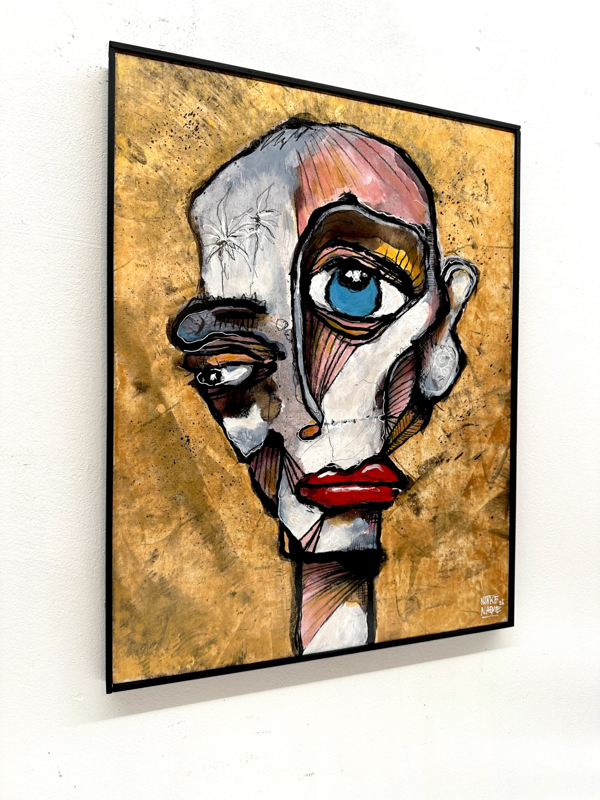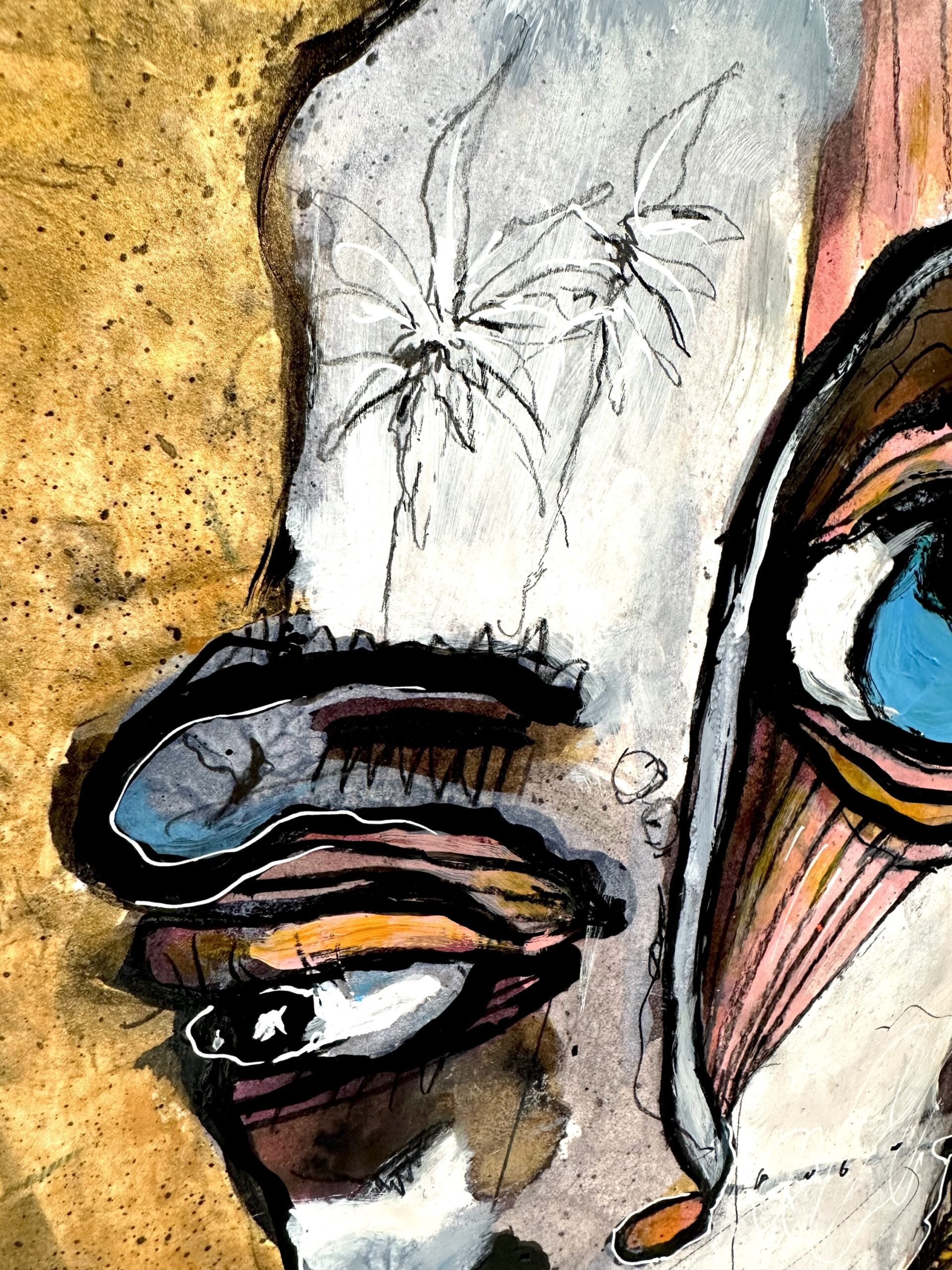 This painting is a unique, hand-finished artwork created using acrylic paint, pen, pencil, and soft pastel on an ink-printed base.
